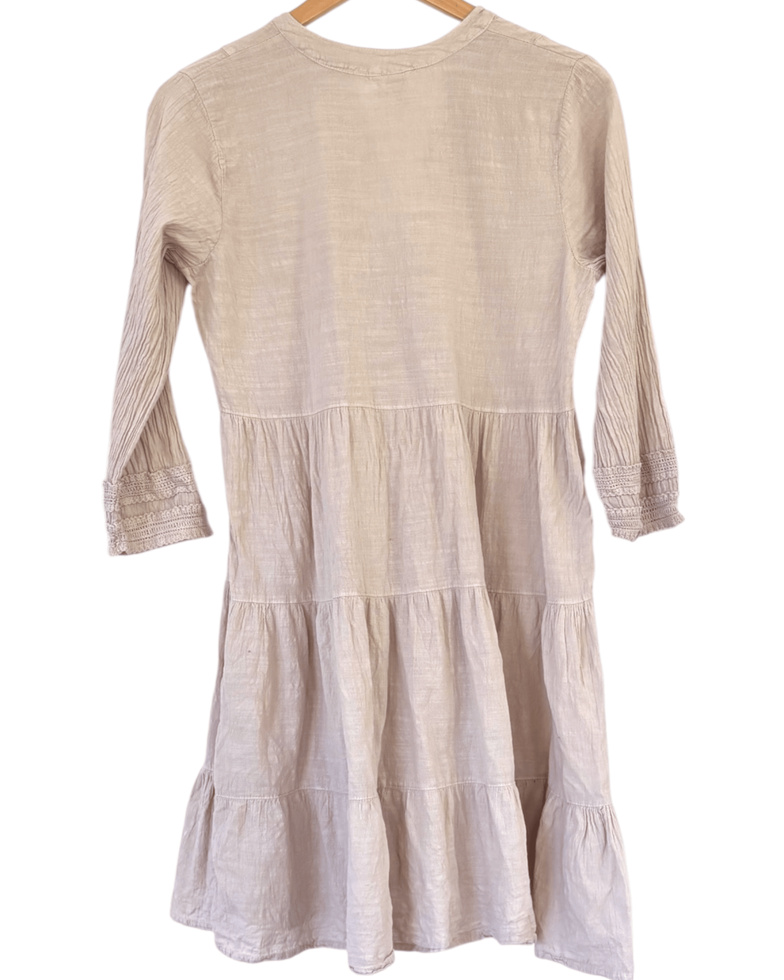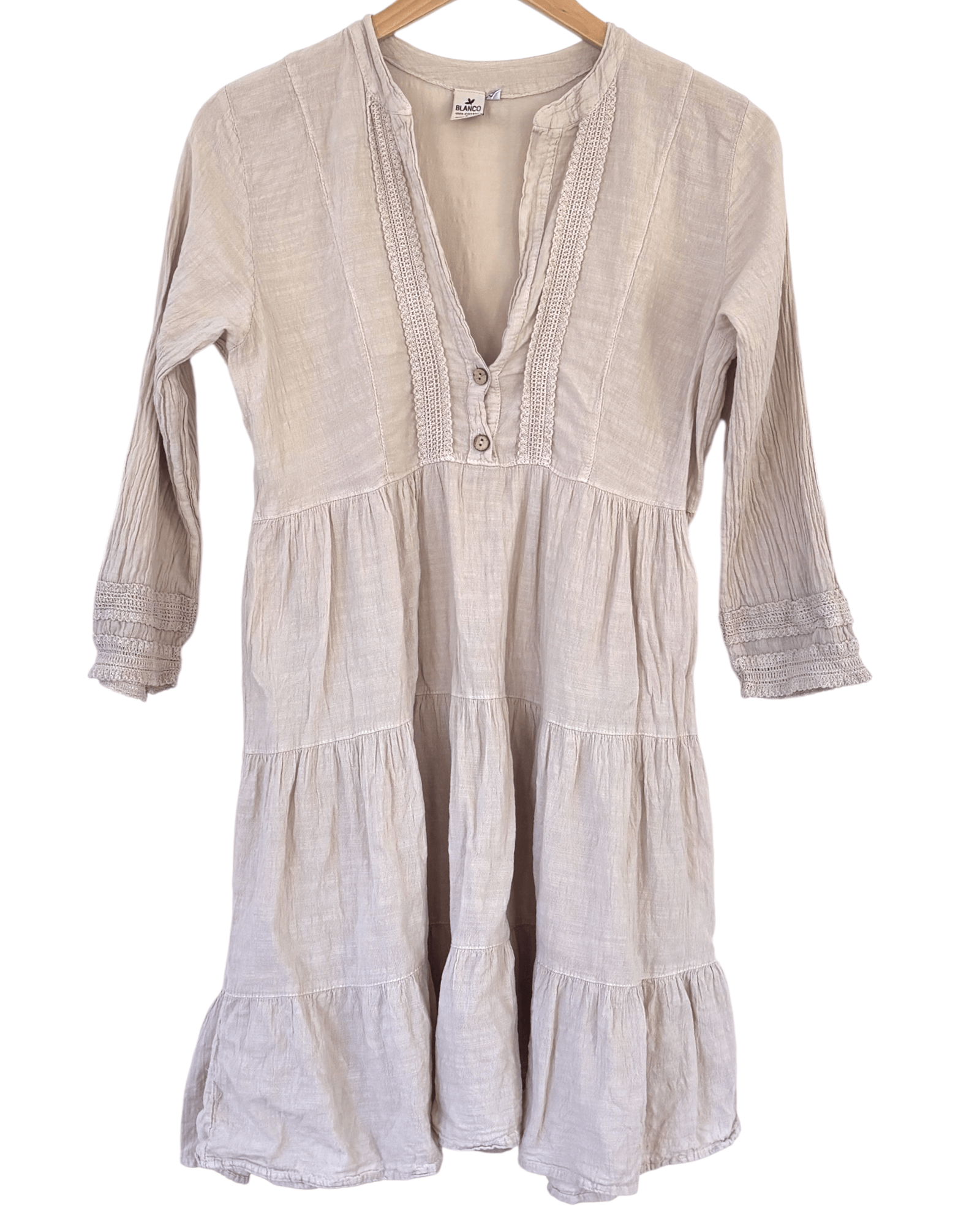 preowned SMALL BLANCO tiered crochet lace dress in Dark Autumn putty. A flirty boho dress with a deep-v neckline secured with two wooden buttons. Crochet lace details at yoke and cuffs. 100% cotton construction