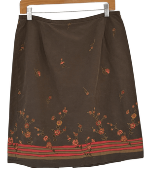 preowned SIZE 12/PETITE ANN TAYLOR silk pencil skirt in Dark Autumn floral print. A classic pencil skirt with a unique print in luxurious silk. Charming blooms emerge from a striped hem as if joyfully tossed up into the air! Hidden zipper closure in back. Fully lined 100% silk construction