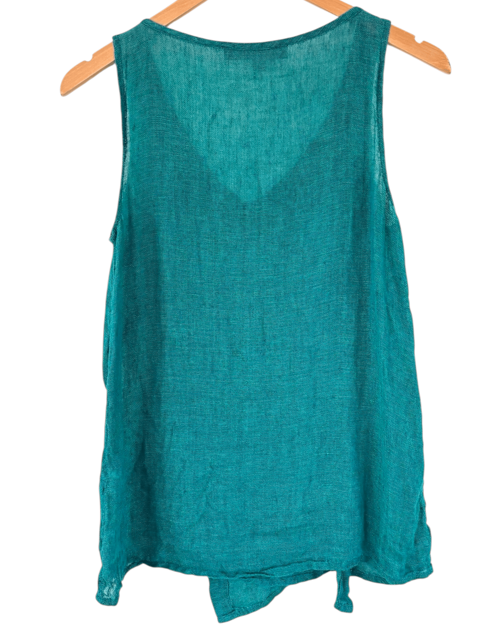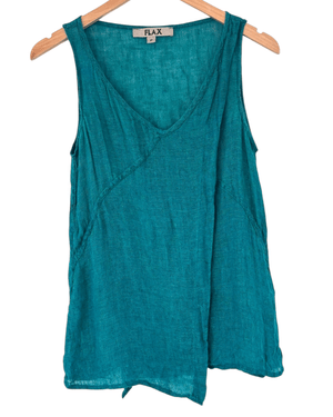 preowned SIZE 4-6* FLAX sleeveless v-neck linen top in Warm Autumn riverway green. This fantastic 100% linen top features a deep-v neckline and faux-wrap styling for a relaxed, breezy silhouette.