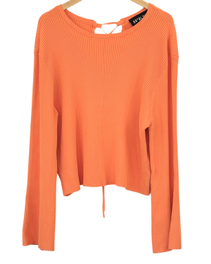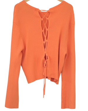 NWT XXXL ROYALTY by MALUMA lace-up ribbed knit top in Warm Autumn persimmon orange. An open lace-up back sets the tone for chic style in this long sleeved pullover top. Features ribbed texture, slightly belled sleeves, and cropped length. Rayon/nylon knit construction offers an excellent stretch